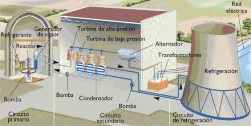 Una central nuclear es una central termoeléctrica en la que actúa como caldera un reactor nuclear. La energía térmica se origina por las reacciones nucleares de fisión en el combustible nuclear formado por un compuesto de uranio. El combustible nuclear se encuentra en el interior de una vasija herméticamente cerrada, junto con un sistema de control de la reacción nuclear y un fluido refrigerante, constituyendo lo que se llama un reactor nuclear. El calor generado en el combustible del reactor y transmitido después a un refrigerante se emplea para producir vapor de agua, que acciona el conjunto turbina-alternador, generando la energía eléctrica.