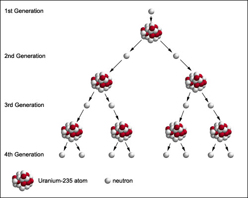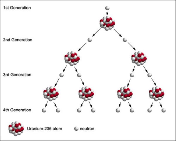 Si en cada fisión provocada por un neutrón se liberan dos neutrones más, entonces el número de fisiones se duplica en cada generación. En este caso, en 10 generaciones hay 1.024 fisiones y en 80 generaciones aproximadamente 6 x 1023 fisiones.